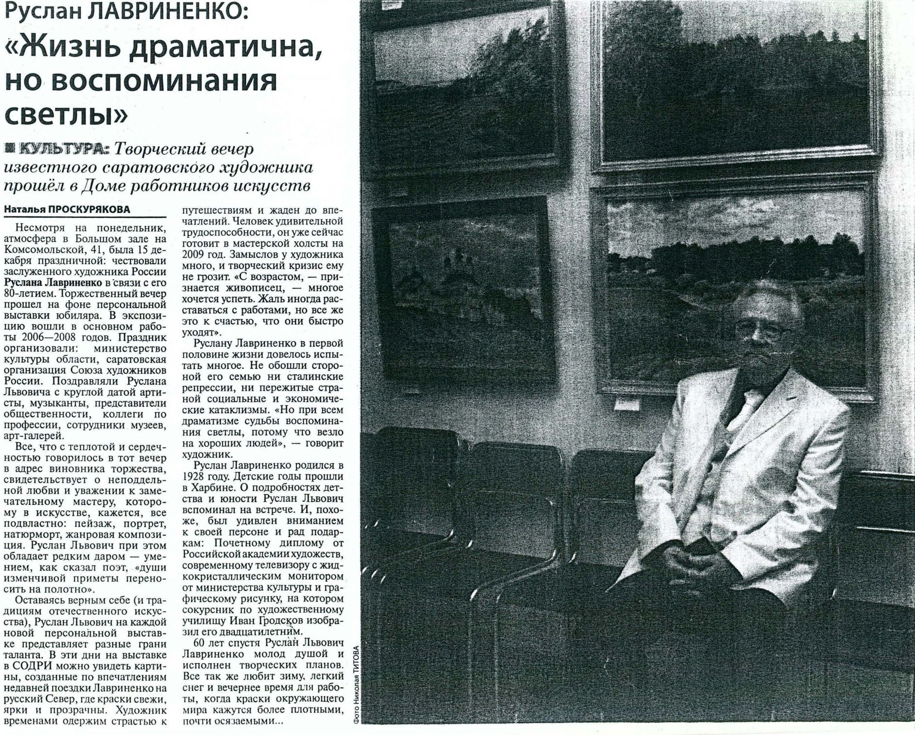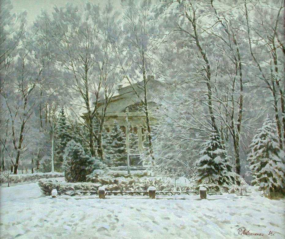 Медленный, плавный взгляд по заснеженным чистым полям, окаймленным темной полосой деревьев, по вдруг ниоткуда взявшейся аккуратненькой избушке, снова по уходящим вдаль просторам это пристальный взгляд одинокого путника, ищущего вдохновения и покоя в мудрой красоте природы. Неоднократно художник обращается и продолжает обращаться к теме Москвы и Подмосковья. Новодевичий монастырь, собор Василия Блаженного, Васильевский спуск, соборы Сергиева Посада - к этим мотивам Лавриненко обращался неоднократно.