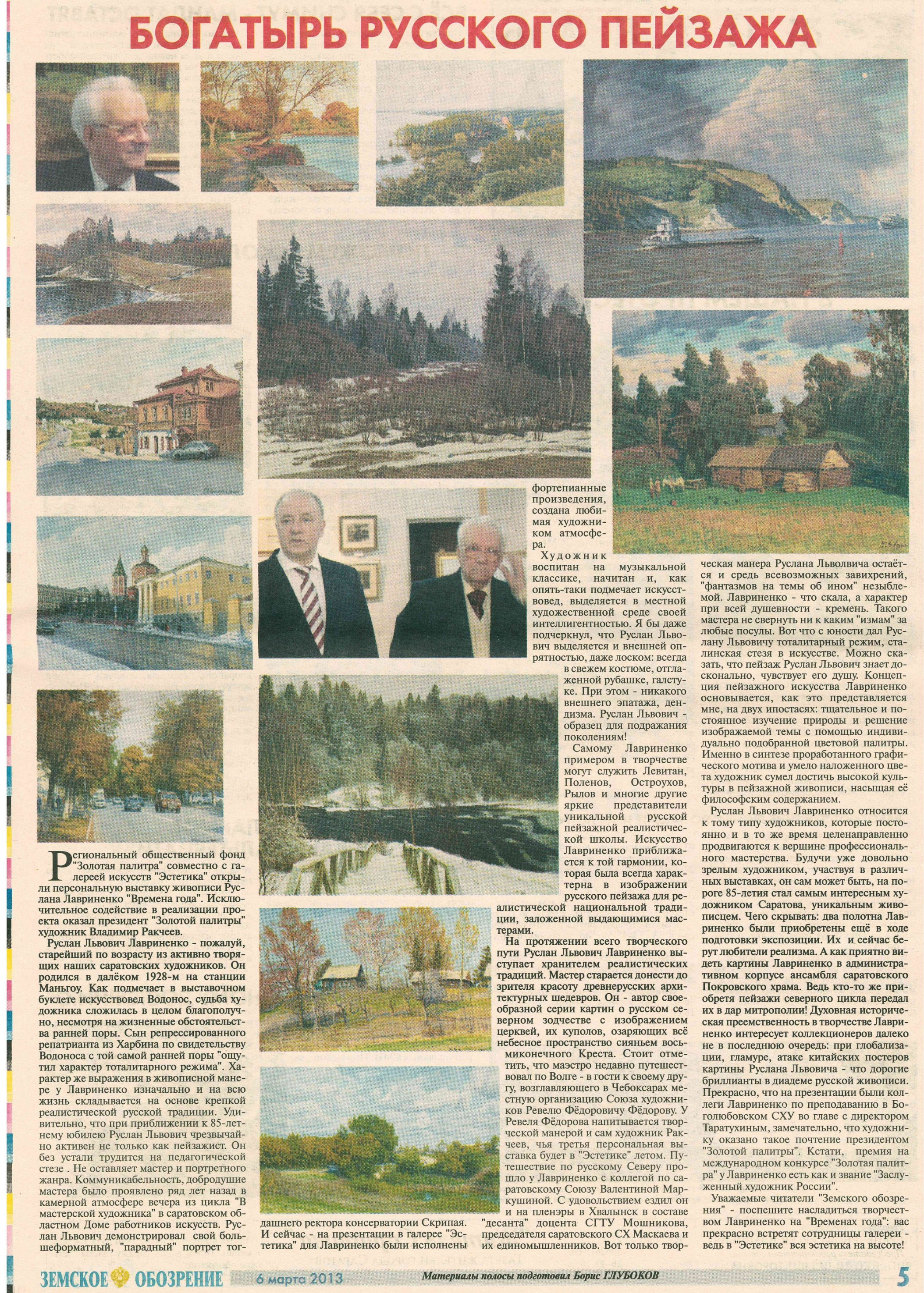 Отсюда такая гармоническая взвешенность объективно-достоверного и субъективно-лирического, на этом и зиждется добротная традиционность его искусства. Художника не привлекали ни модная метафоричность, ни условно-символический строй картин, ни дотошный фотореализм. Лавриненко всегда точен в живописном воссоздании реалий конкретного ландшафта. Но во всех его невыдуманных пейзажах использован не столько изобразительно-информационный подход, сколько лирико-философский: они дают полное эмоциональное представление о саратовских, тверских и других мотивах. Образная убедительность делает их понятными и доступными для восприятия каждого. Кажущаяся графичность живописного языка коренится в самом методе построения пейзажного образа: четкость очертаний, прорисованность всех форм — свидетельство важности для мастера предметно-изобразительного начала, осязаемо-точной передачи конкретных деталей. Но именно цвет создает в одних пейзажах ощущение свежести и простора, в других - мелодию пасмурного дня. Сдержанная выразительность колорита побуждает задуматься о скрытой жизни природы, помогает почувствовать «душу» пейзажа. В гармоническом равновесии линейного и цветового начала сказывается зрелость художественного вкуса мастера, убедительная завершенность каждого его произведения.